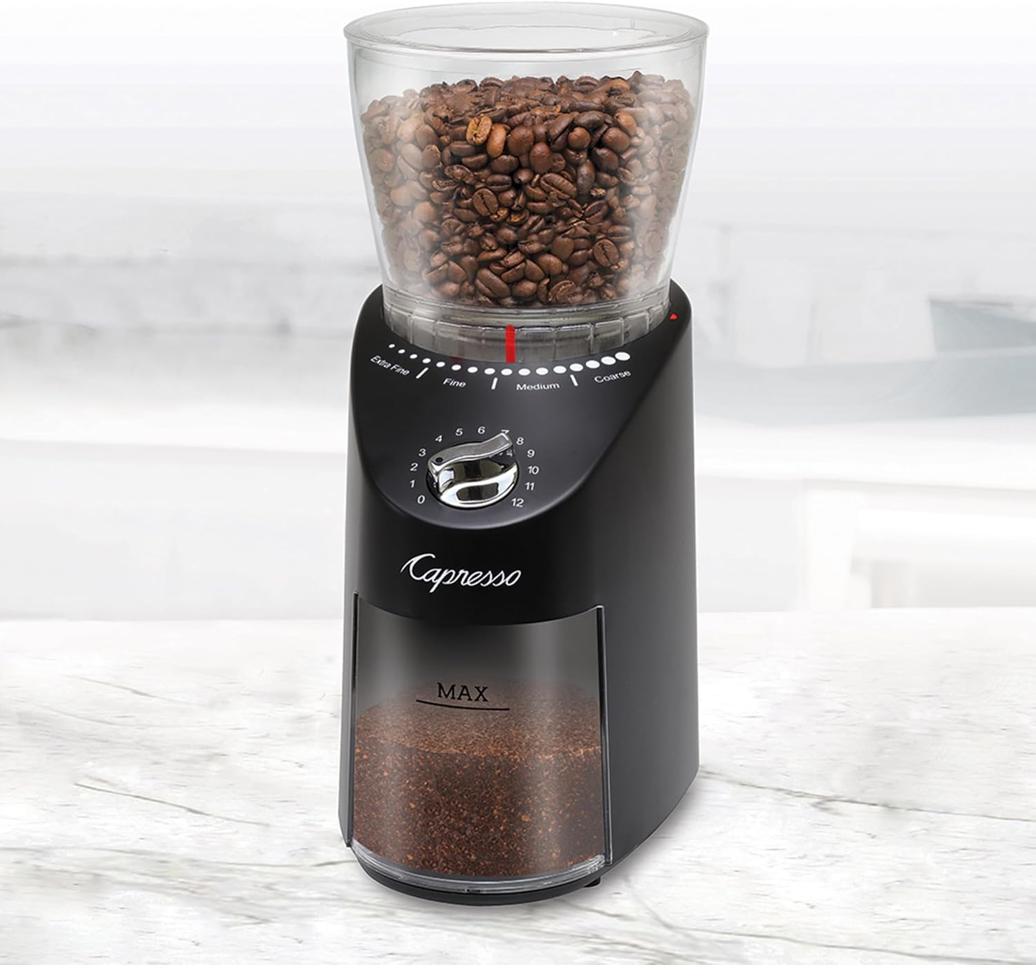 The Capresso Infinity Plus Conical Burr Grinder (Black) features: