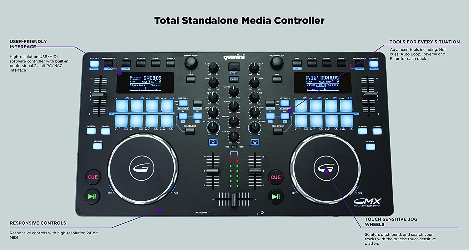 The GMX Media Controller System from Gemini is the perfect addition to any DJ set up. If you want easy portability with the functionality of a full controller, the GMX was built for you. This multi-format media controller suits any DJ who wants to live free from the ball-and-chain of a laptop. DJs of every experience level will experience fantastic playback from a single USB drive or laptop hosting Virtual DJ or another software application. See your music come to life with the GMX system when MP3 and WAV files light up on the unit's high-contrast screens with adjustable waveform displays making beat-matching a breeze. The inclusion of Variable Pitch Control, Master Tempo Control and BPM Lock you can match keys, tempos and mix without restraint. The GMX media player features 8 large performance pads on each deck and comfortable, expertly-designed touch-sensitive jog wheels serve you an intuitive layout and complete control over playback.