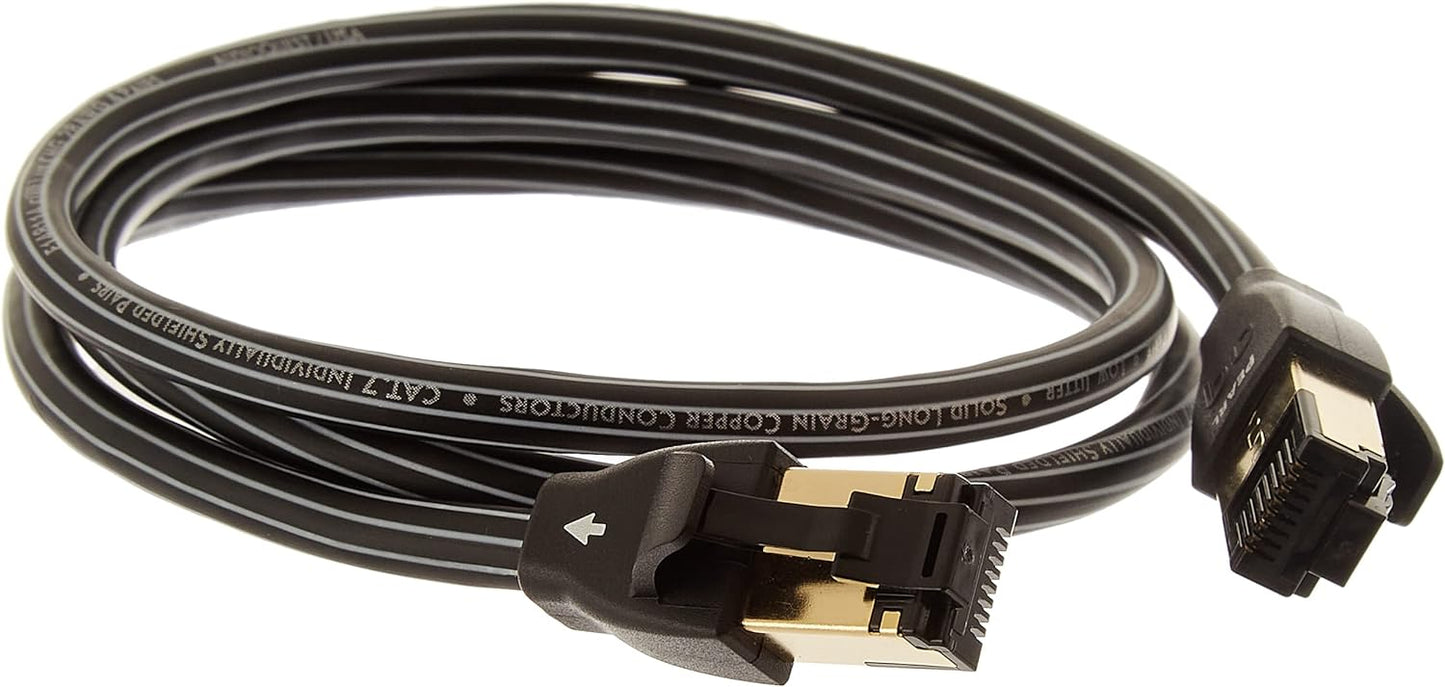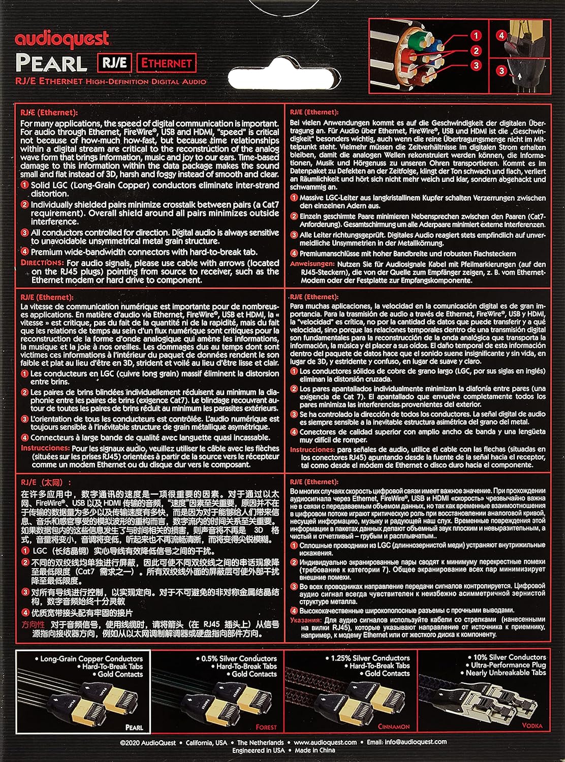 RJ/E Pearl prepared Cat 7 Ethernet cables use Solid Long-Grain Copper (LGC) conductors, which completely eliminate strand interaction, one of the biggest sources of distortion in cables, for clearer, more dynamic, and more involving sound. Superior conductor metals minimize distortion by having fewer grain boundaries and fewer impurities (such as oxides) at those boundaries. Solid High-Density Polyethylene (PE) insulation helps maintain critical signal-pair geometry. Of course, all AudioQuest Ethernet cables honor the directionality inherent in all analog and digital audio cables; arrows on the jackets indicate the direction (from source to destination) for the best audio performance.