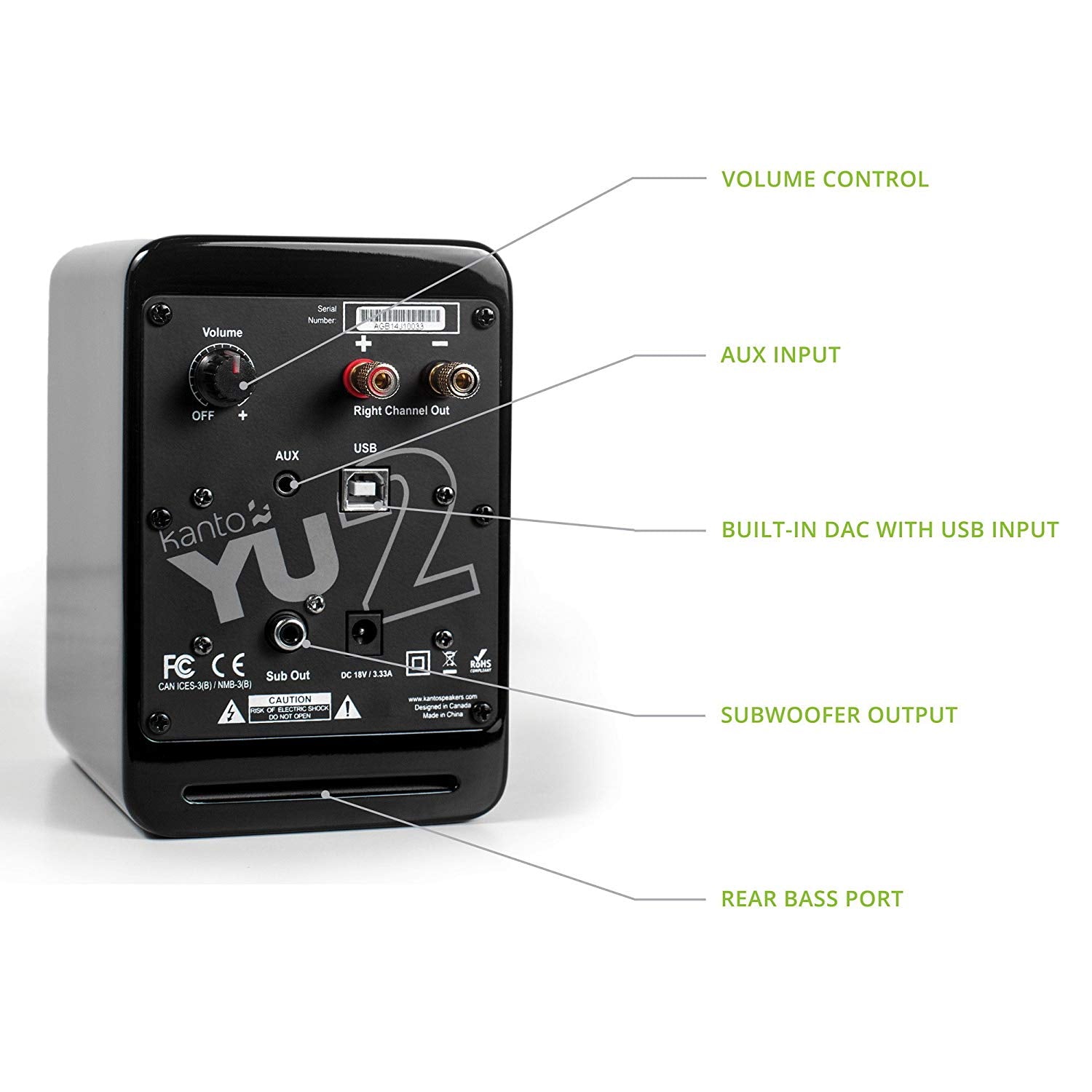 Use the AUX input with the included Kanto 3.5mm cable to connect any device with a headphone jack to your YU2. Lighten the load on your computer’s CPU by connecting directly to YU2’s built-in DAC via a USB cable for a fully digital, high-quality audio connection. If you want a little more kick, connect a powered subwoofer to the SUB OUT port.