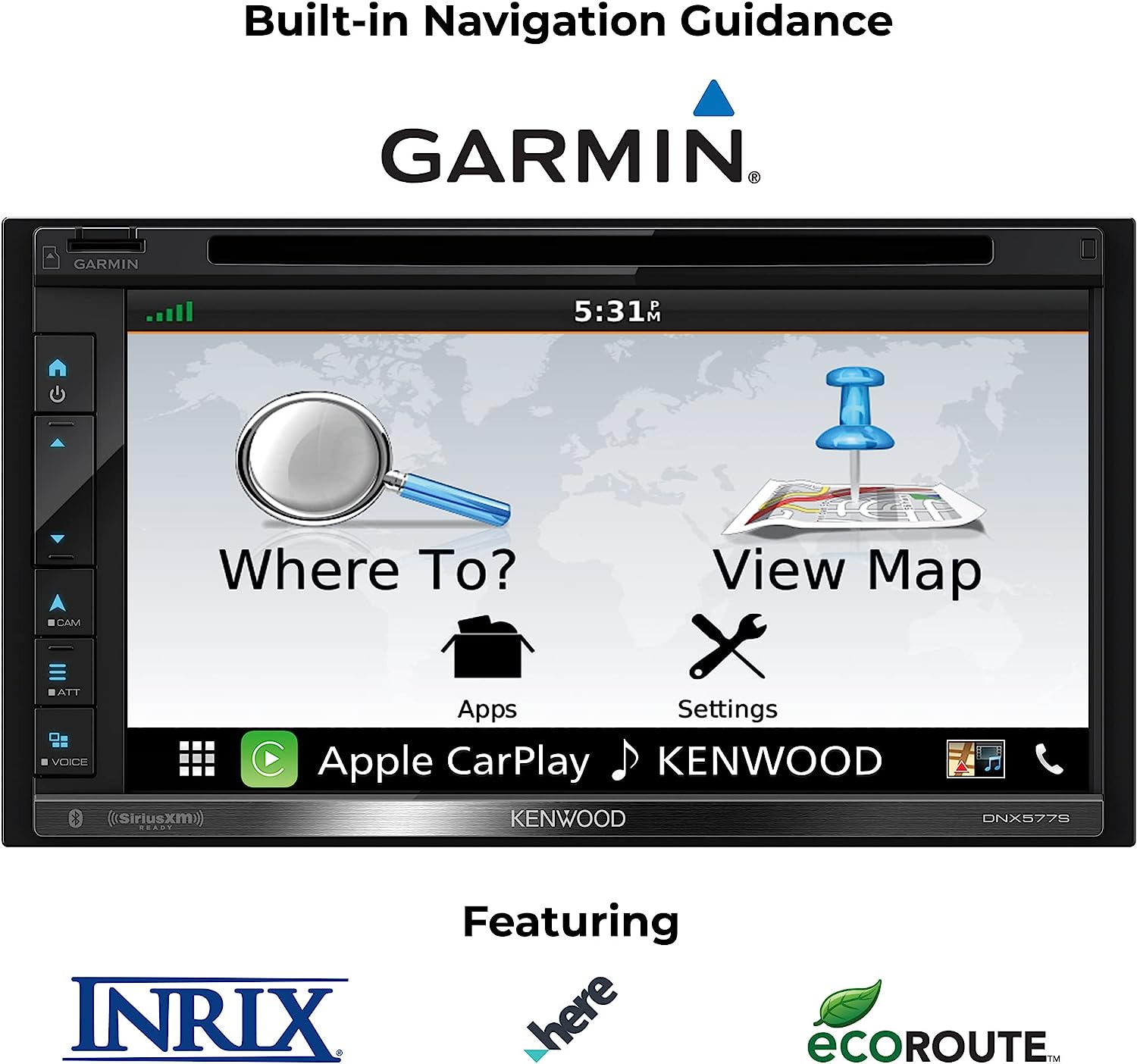 Garmin Navigation: With built-in Garmin & HERE navigation software and map data, the Kenwood DNX577S features on-screen maps of the United States, Puerto Rico, Virgin Islands, Canada, and Mexico. The built-in maps include over 6-million Points of Interest (POIs) such as hotels, restaurants, gas stations, attractions, parking, airports, ATMs, and more. The built-in navigation software provides you with calculated on-screen routes and audible directions to follow in order to reach your destination safely.