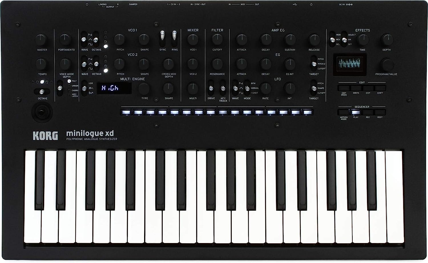 - 37-key, 4-voice polyphonic analog/digital synthesizer