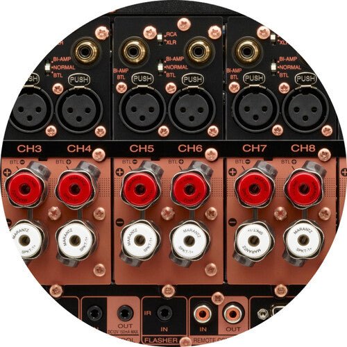 Supporting some of the largest home theaters, the AMP 10 16-Channel 200W Power Amplifier from Marantz makes for a fine addition to your home audio system, delivering a total of 16 separate speaker channel connections that take advantage of switchable unbalanced RCA or balanced XLR inputs. By default, you get a whopping 200W per channel at 8 ohms, but can utilize bridge mode to combine two channels for 400W per channel at 8 ohms. You also have the option of bi-amping if desired, further purifying your audio by separately driving high and low frequencies. On the front is a sleek metal face with a single porthole that houses a softly illuminated analog output meter.