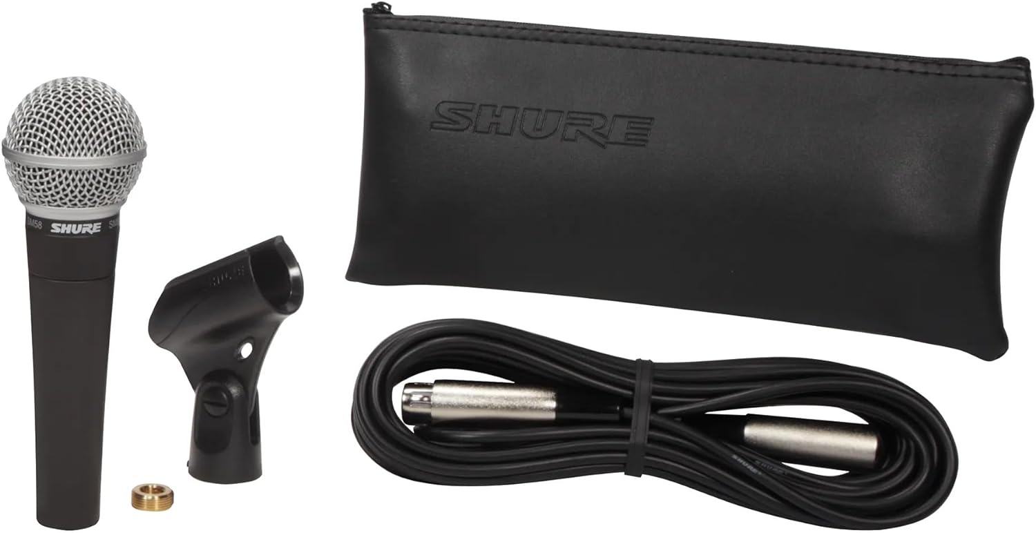 The Shure SM58-CN Vocal Microphone features a cardioid dynamic vocal design well suited for professional vocal use in live performances, sound reinforcement, and studio recording. A built-in spherical filter minimizes wind and breath "pop" noise, while the cardioid pickup pattern isolates the main sound source while minimizing unwanted background noise. The microphone offers durable construction, a high-quality internal shockmount system, and a steel mesh grille for withstanding rough handling. The SM58-CN is designed to perform consistently both outdoors and indoors and when used for singing or speech applications. The microphone includes a microphone clip , a 25' XLR to XLR microphone cable, and a zippered pouch.