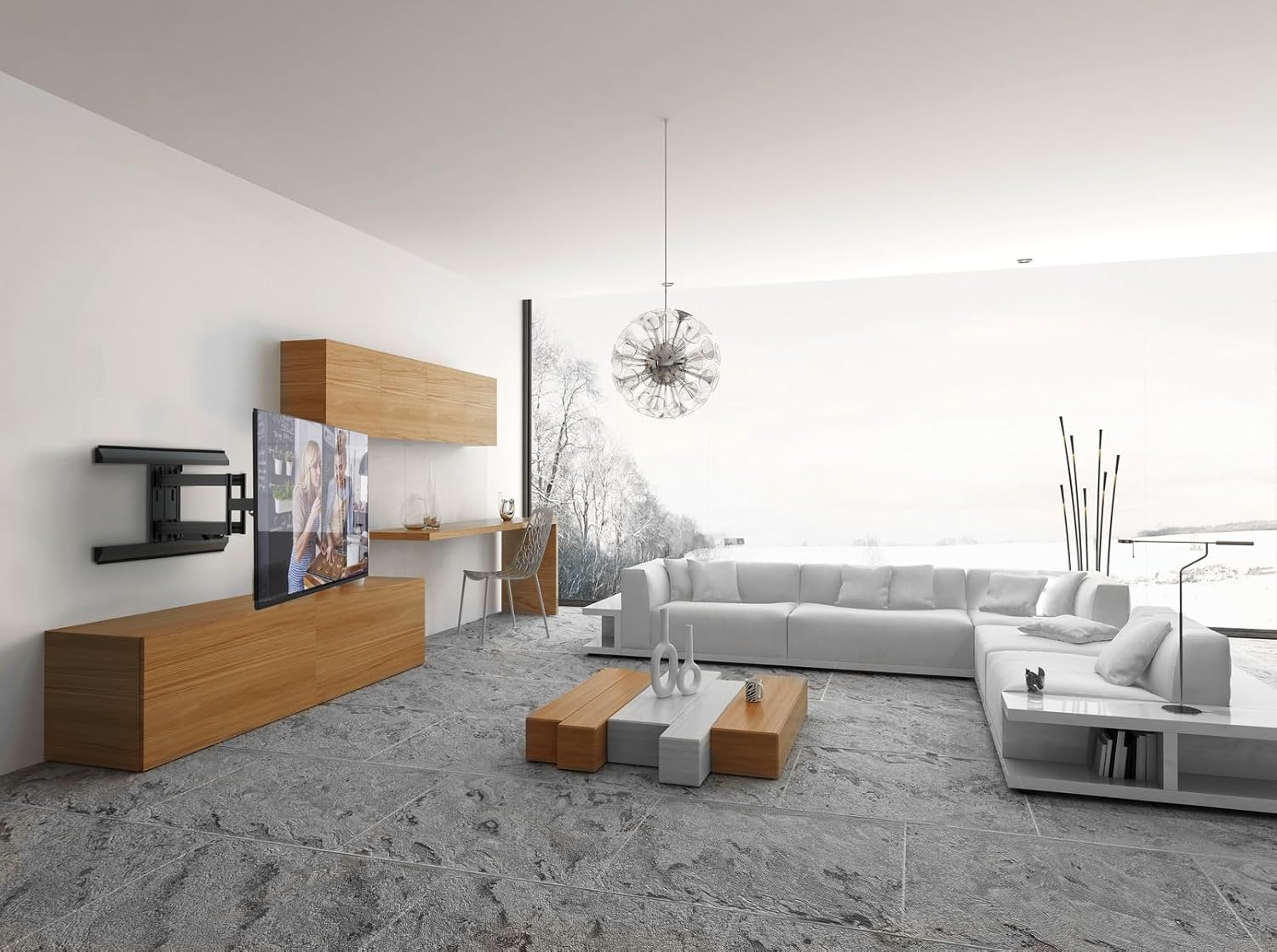 The black Kanto PMX680 Full-Motion Wall Mount is designed to mount flat-panel displays measuring 39 to 80" and has a maximum load capacity of 125 lb. The mount is compatible with displays that have a 200 x 100 to 700 x 400mm mounting pattern. Its distance from the wall can range from 2.5 to 24", with a horizontal offset of 18", and it provides -3 to 12° of tilt, up to 180° of swivel, and has adjustable horizontal leveling.