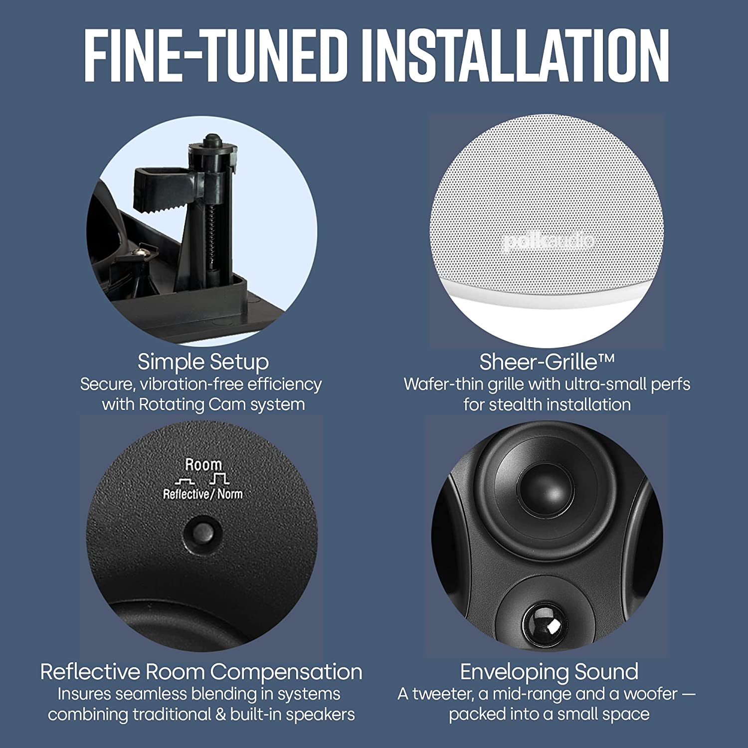 Designed to offset reflective surfaces with no sound distortions, this 3-way driver array produces BIG, FULL-RANGE PERFORMANCE FROM A DECEPTIVELY SMALL IN-CEILING SPEAKER. Total Frequency Response- 34 Hz → 27,000 Hz