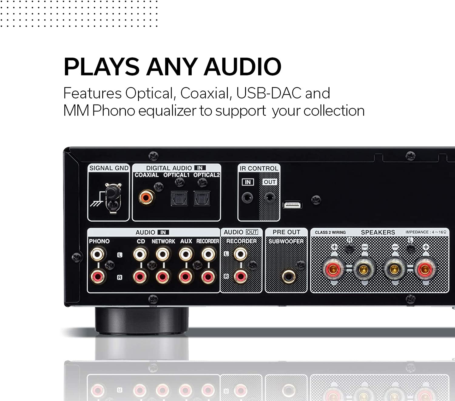 Enjoy high-resolution stereo sound with your speakers and the Denon PMA-600NE 90W Stereo Integrated Amplifier. It outputs up to 45W per channel at 8 Ohms and features an SLDC chassis design to help isolate the internal components to minimize interference. It allows you to input digital audio signals via digital coaxial and two optical inputs. Four stereo RCA inputs let you connect analog devices, and the MM phono input enables connectivity with a variety of record players. The PMA-600NE includes a remote control as an added convenience.
