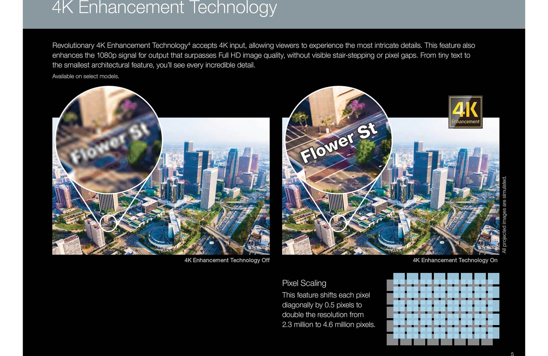 - 4K Enhancement Technology shifts each pixel diagonally by half a pixel to provide a more detailed, higher-resolution image than 1080p
