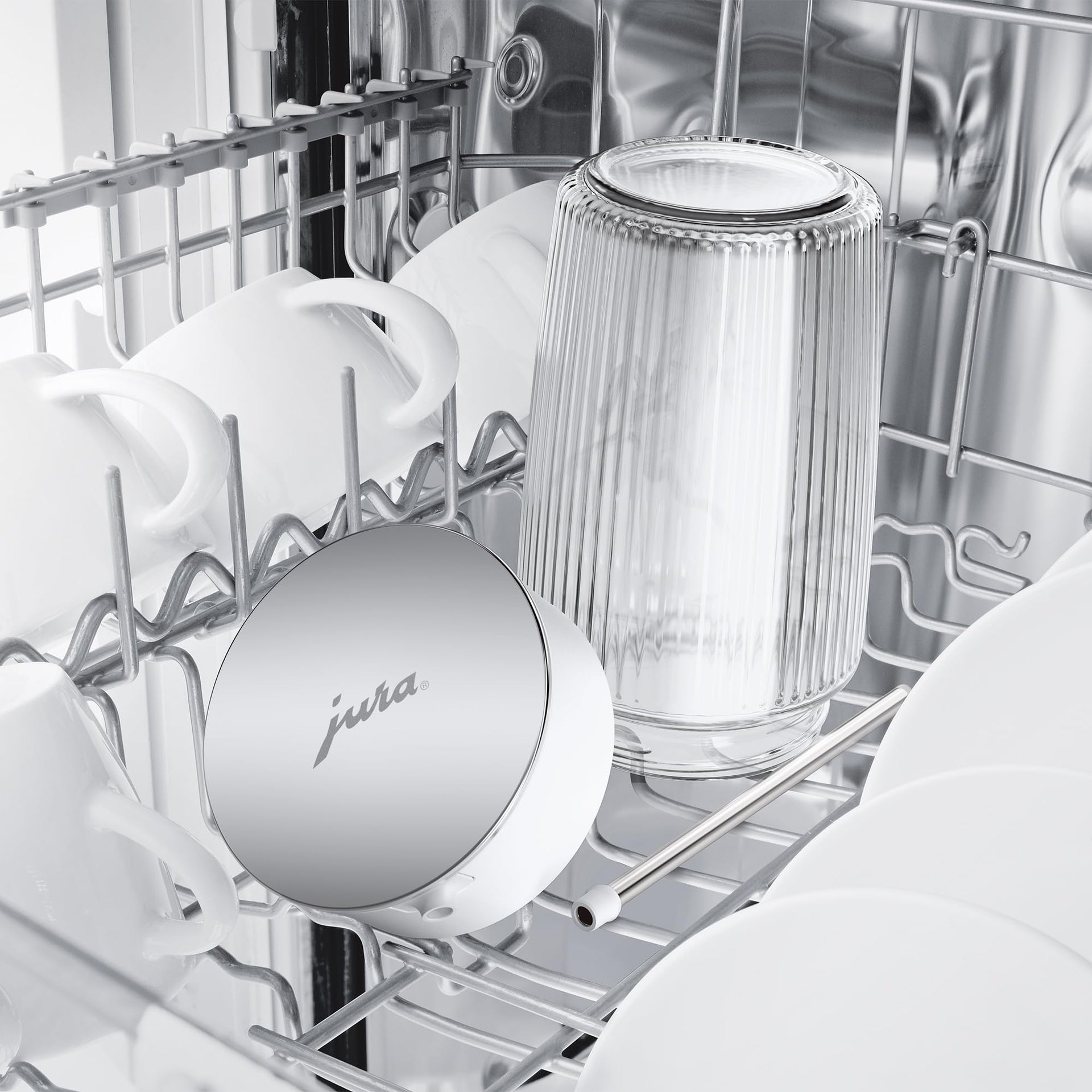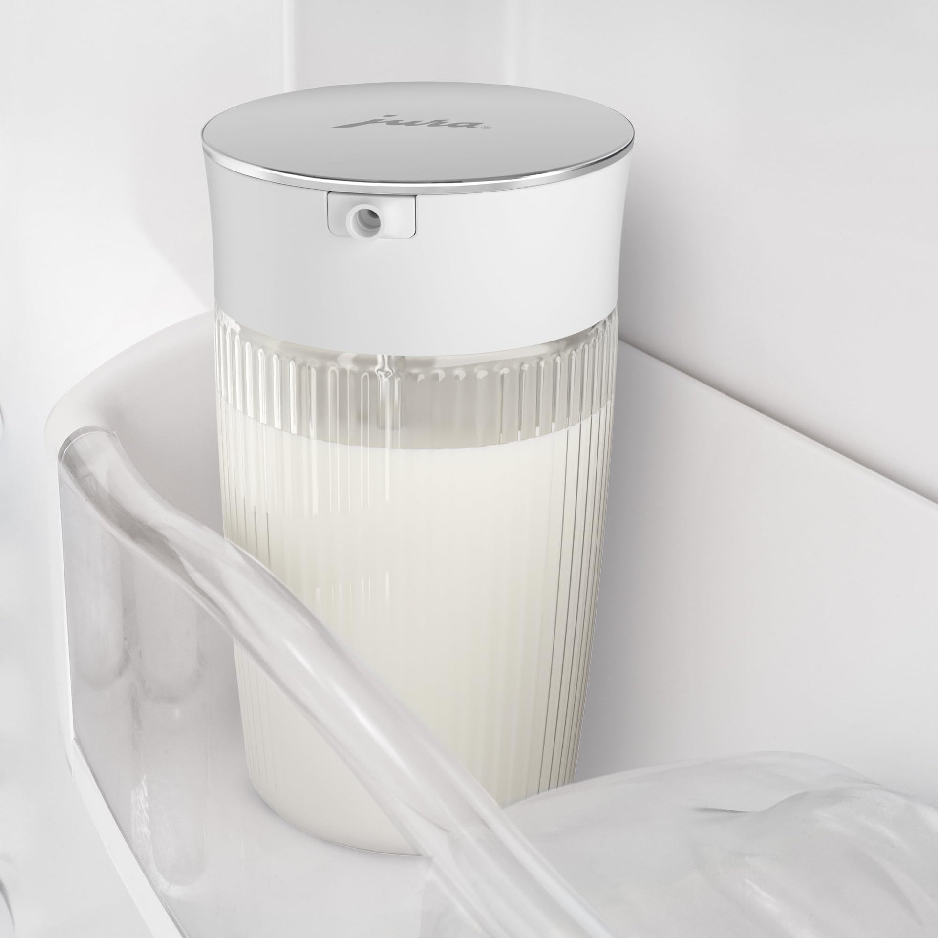 Made from polished stainless steel, the carafe’s lid practical design smoothly swivels open and close, ensuring it’s easy and hygienic to fill with milk or milk alternatives. Made from borosilicate glass, the milk carafe is resistant to temperature fluctuations and scratches. The carafe features an elegant ribbed exterior that grips easily in your hand and the thick, sturdy base prevents slipping on surfaces. Dishwasher-safe (top rack only). Thanks to the included silicone adapters in white or black, you can indicate whether the carafe is filled with milk or milk alternatives. Showcasing the JURA design, the milk carafe captivates with its cool Nordic charm. With its clean and pure lines, this accessory makes a stylish and practical addition to a JURA automatic coffee machine and is perfect for everyday use.