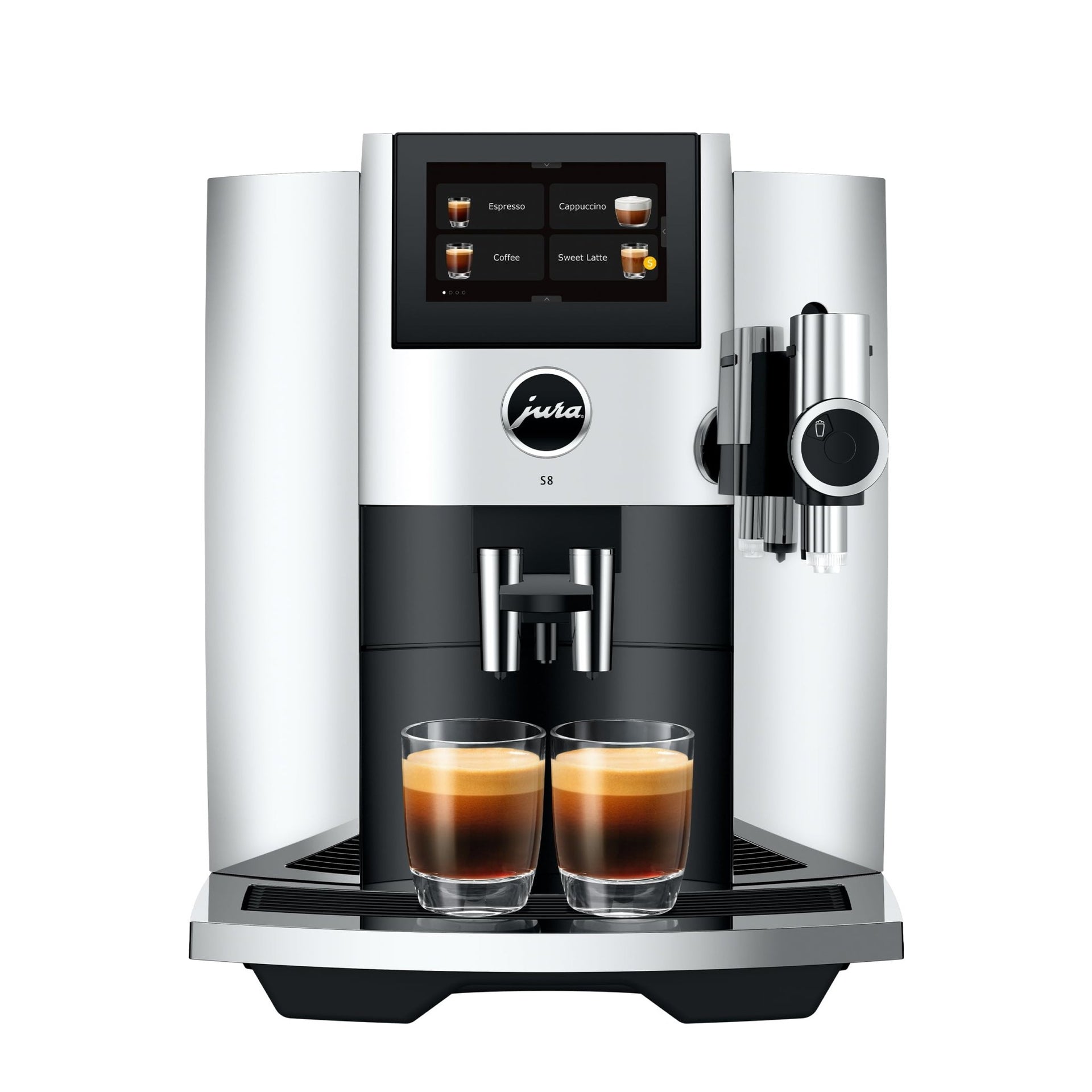 The elegant JURA S8 boasts a large color touchscreen that is remarkably simple to use. Graphics and animations guide you through brewing, and you can save and name your favorite drinks so they're always ready at a touch. JURA's professional foam frother creates the finest-textured milk foam for exceptional latte macchiatos and other specialties.