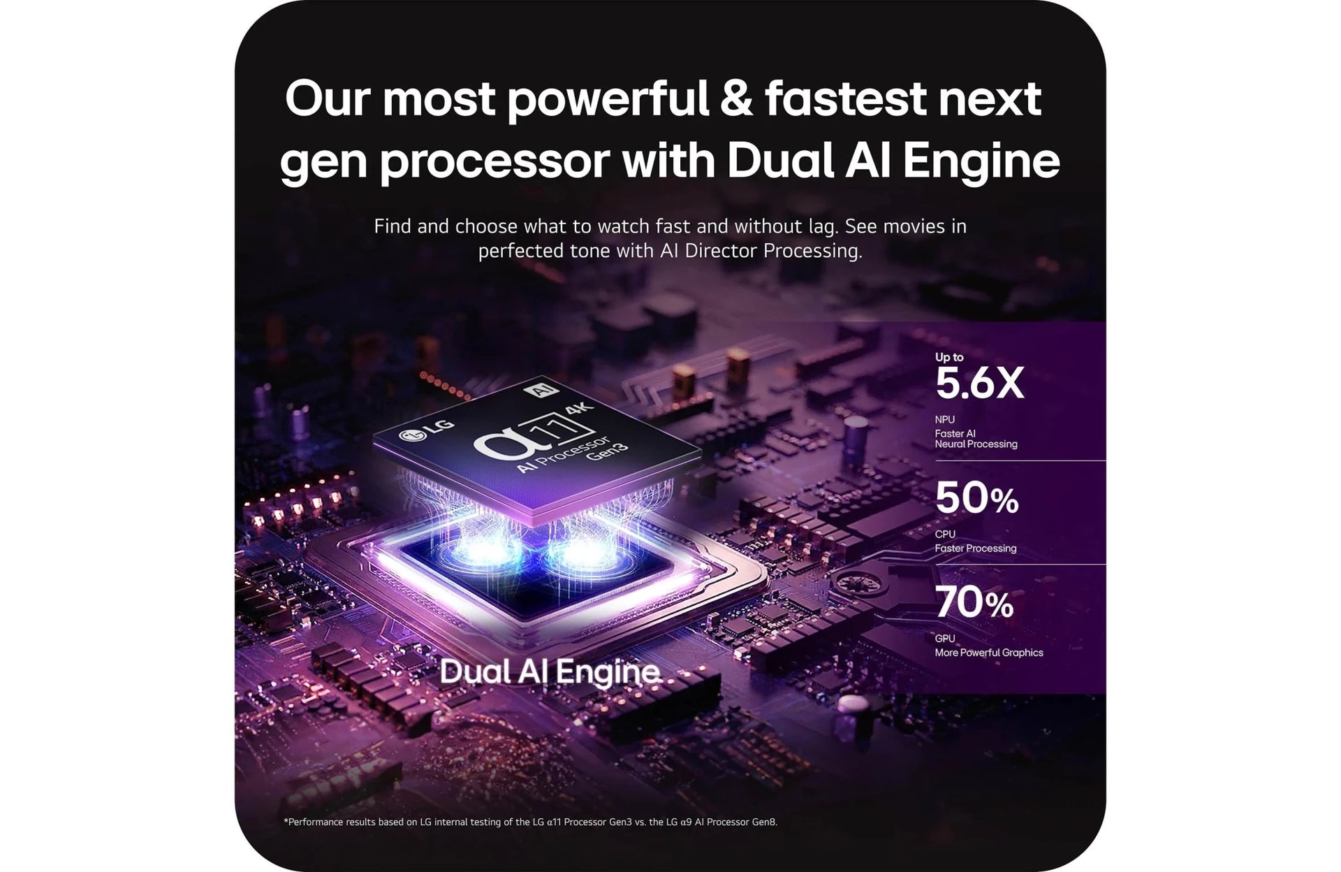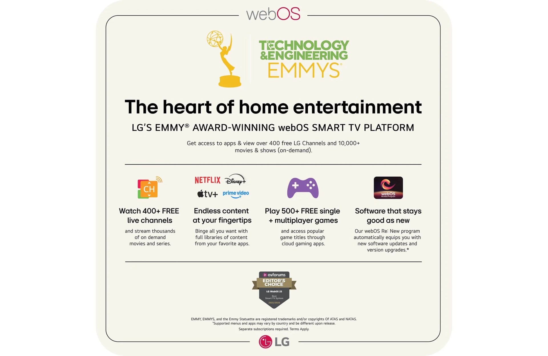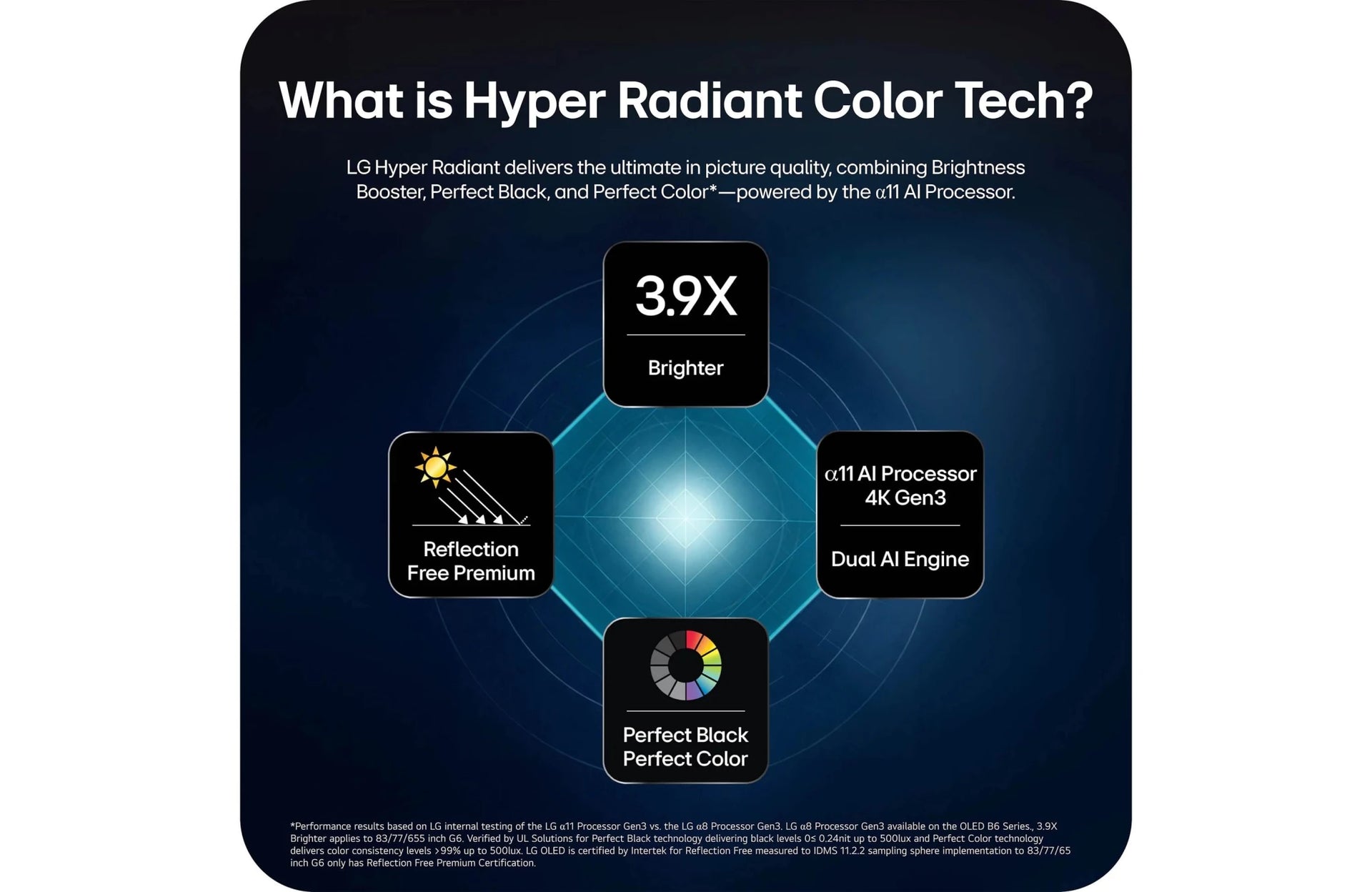 Introducing the all-new LG OLED evo G6 with next-gen AI for a smarter personalized experience and spectacular bright-room ready picture. The LG OLED evo G6-Series is powered by the Alpha α11 AI Processor Gen 3 for even better and more customized picture and performance. Brightness Booster Ultimate produces up to 3.9X brighter images,¹ for luminous, high-contrast picture quality that is both glare and reflection free. All while still delivering perfect black and perfect color powered by 8.3 million self-lit smart pixels. When you're not watching, you can display art, photos and other content to blend the LG OLED evo G6 into your surroundings. Search less and stream more, thanks to the next generation of AI technology from LG webOS 26. And with Quick Cards, you can group your favorite apps and use the Magic Remote to easily find exactly what you're looking for—like instant access to over 400 free channels with LG Channels and 10,000+ movies & shows (on-demand).² Every LG OLED comes loaded with Dolby Vision for extraordinary color, contrast and brightness, plus Dolby Atmos for sound you can feel all around you. You'll land in the center of the action with FILMMAKER MODE, allowing you to see films in the director's original formatting. Plus, with a 5-year panel warranty,³ you can watch on and on with confidence and peace of mind that we stand behind our premium LG OLED evo TVs.