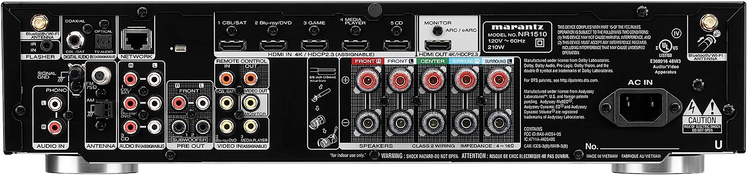 Experience exceptional audio performance from the slim profile Marantz NR1510 5.2ch 4K Ultra HD AV receiver that drives elevated surround sound and high-fidelity audio from a compact chassis. At half the height of a traditional AV receiver, the NR1510 features the latest in HDMI connectivity and delivers high-resolution surround sound from Dolby TrueHD and DTS-HD Master Audio. Six HDMI inputs — including one on the front panel — support the latest video and picture formatting and eARC transmission of enhanced audio. Stream music from popular online sources, and easily connect your analog turntable to the receiver to enjoy your vinyl collection. Control the NR1510 with voice control compatibility via Amazon Alexa, Google Assistant and Apple Siri.