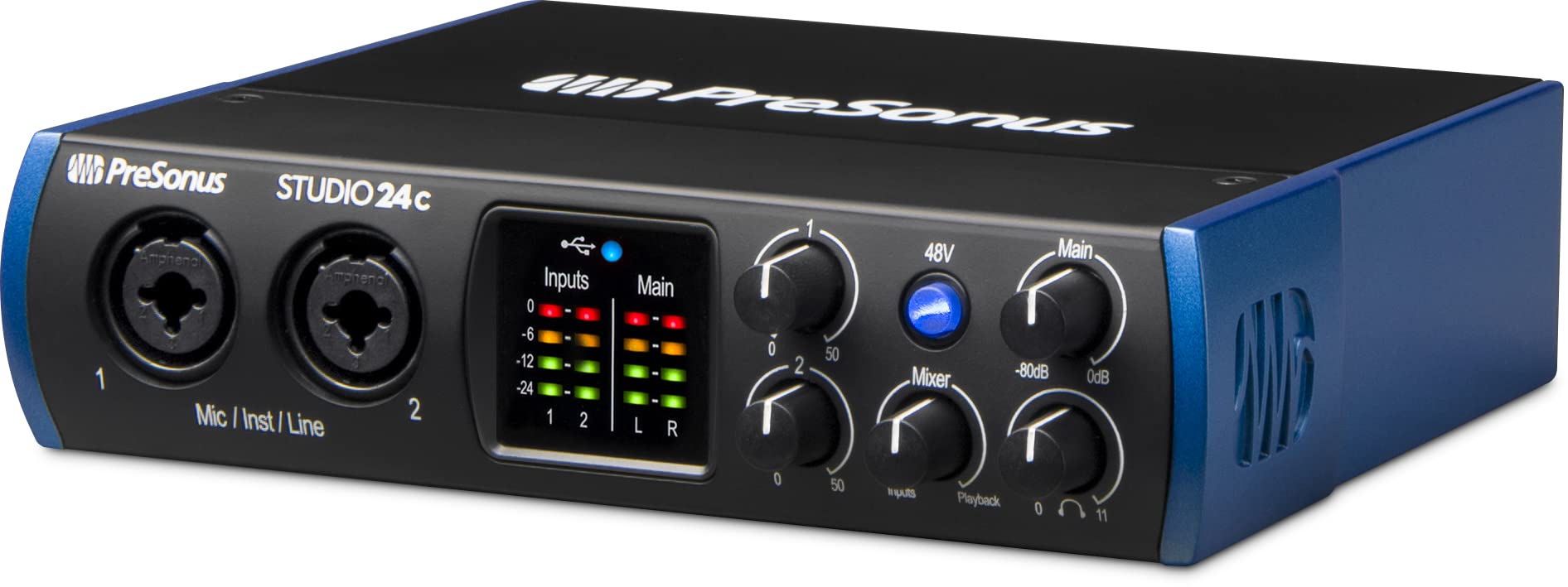 Whether you're laying down your debut album or producing your latest podcast episode, the Studio 24c ensures top-tier sound quality. Featuring two of PreSonus' acclaimed XMAX-L mic preamps for vocal clarity and high-headroom instrument inputs for direct guitar or bass connection, it offers precise input metering for accurate level monitoring. Equipped with premium converters and professional input/output metering, the interface captures rich musical details effortlessly. The intuitive Mix control allows seamless blending of analog inputs and computer playback for optimal monitoring. Ideal for beginners and seasoned producers alike, the bus-powered Studio 24c is built rugged and compact. It includes Studio One 6 Artist Edition software for an immediate start in recording, with compatibility across most macOS and Windows systems and upgrade options to Studio One Pro for advanced production.