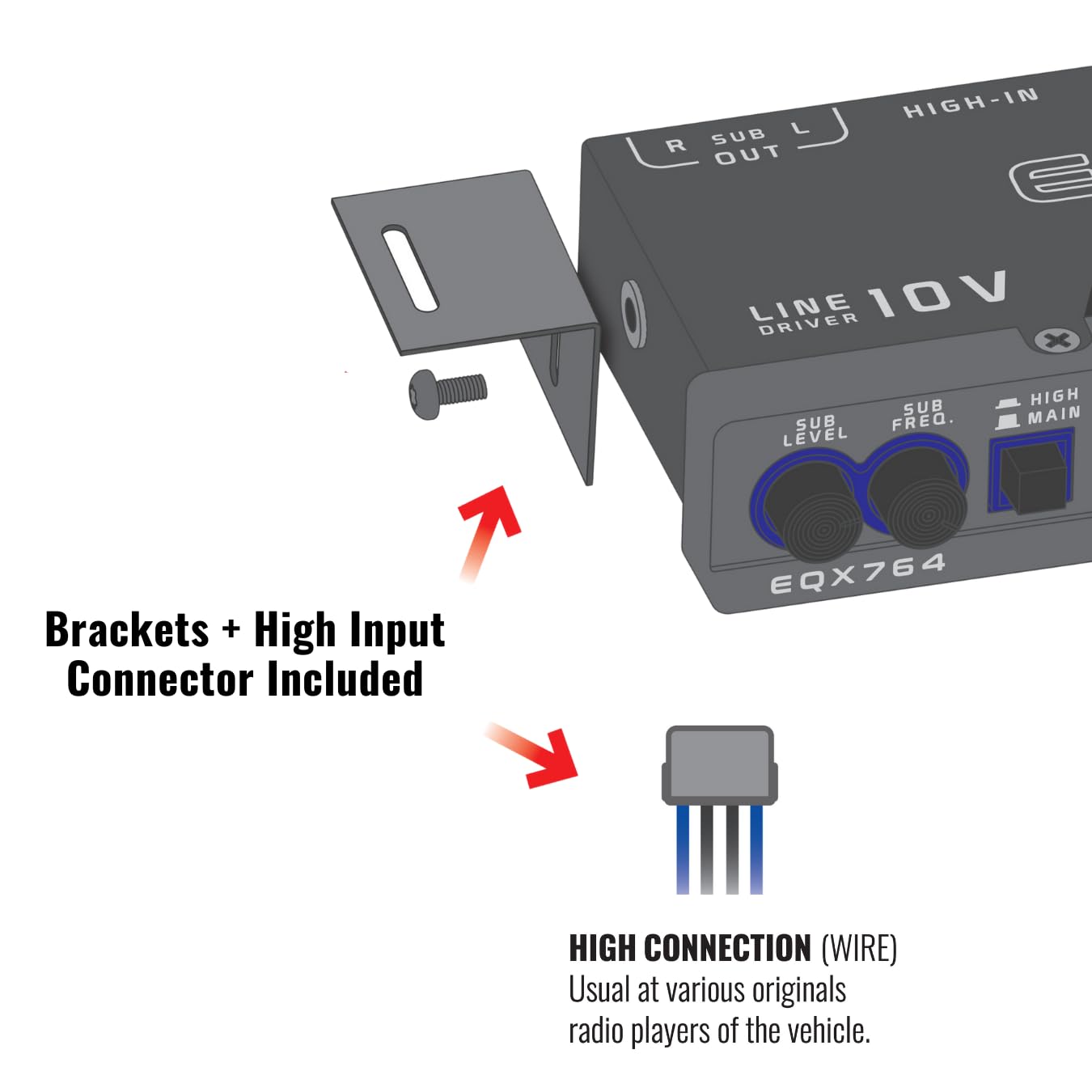 • The EQX764 has dedicated outputs for the SUBWOOFER, in addition to the FRONT and REAR outputs, with various controls for adjusting and equalizing the audio, including: Dedicated LEVEL and FREQUENCY controls for the SUB output; An input channel selection switch (MAIN or HIGH); LEVEL controls for adjusting the level of each input (HIGH and MAIN); FRONT/REAR FADER control for adjusting the balance between the FRONT and REAR outputs; Blue LEDs illuminating the controls for easy adjust