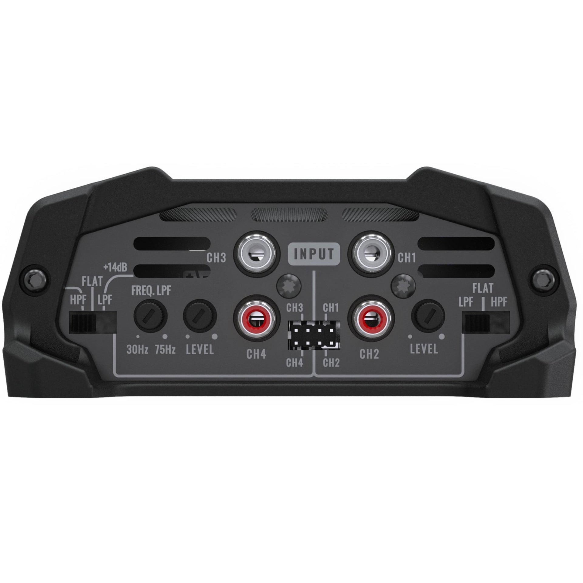 • Audio Controls: Crossover ( HPF & LPF 90Hz for channel 1 & 2 ) + ( Bass boost variable from 30Hz ~ 74Hz +14dB for channel 3 & 4 )