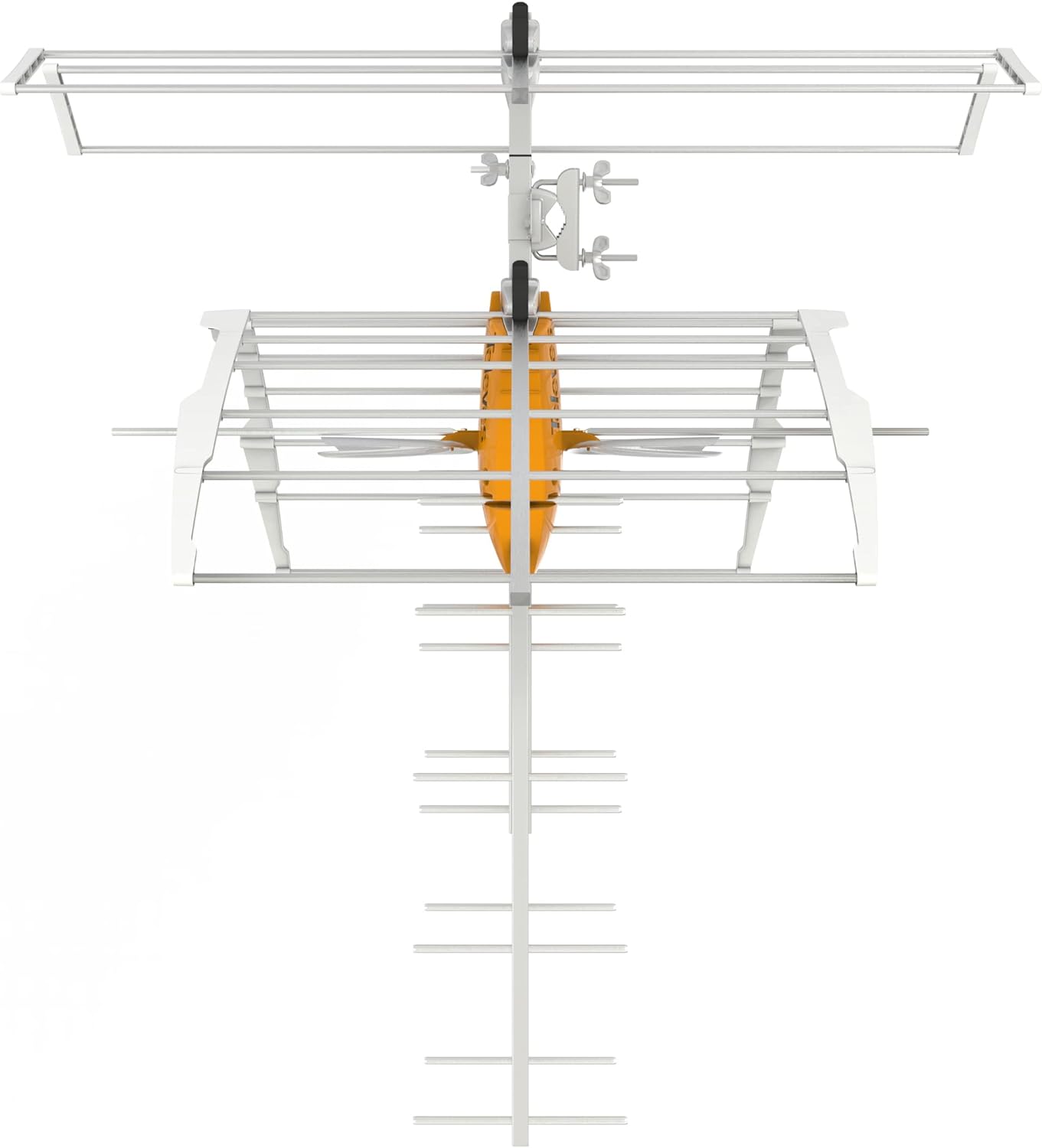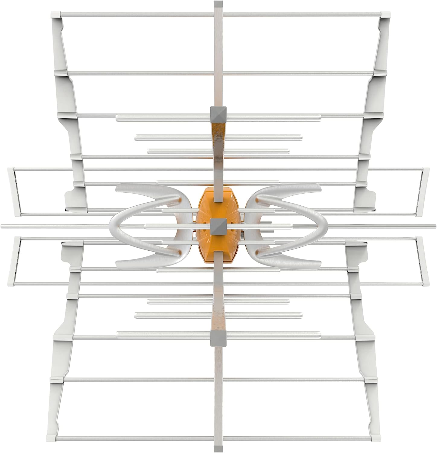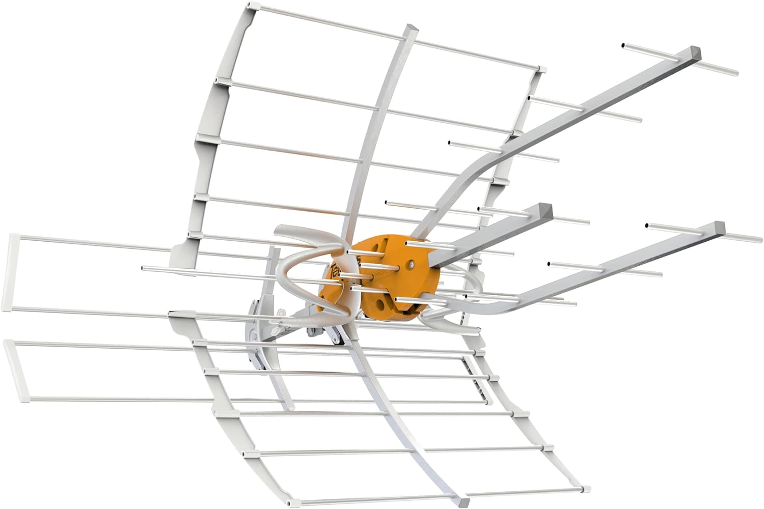 The Televes Ellipse Mix Antenna automatically adapts its gain in real time to optimize the reception of television signals, ensuring the optimum level of signal is always delivered. This antenna has been designed from the ground up for US broadcast frequencies, filtering any interfering 5G signals above 608 MHz, and providing independent amplification for the VHF and UHF bands. The antenna can receive very weak signals while at the same time, avoiding overload caused by very strong signals. The Ellipse Mix is a high-gain directional antenna designed to offer stable and high-quality reception of High VHF and UHF only in mid- to long-range receiving scenarios despite continuous changes in weather and transmitting conditions thanks to its built-in TForce amplifier. The triple boom design ensures maximum raw gain in a compact and install-friendly form factor suitable for outdoor or attic install. The Ellipse Mix assembles in less than 60 seconds. No additional preamplifier purchase is required as the antenna includes a built-in very low-noise TForce preamplifier with automatic gain control, plus FM and cellphone signal filtering adapting to any installation situation. A low-consumption UL-listed power supply is included, providing 2 outputs for convenient distribution to additional TV sets.