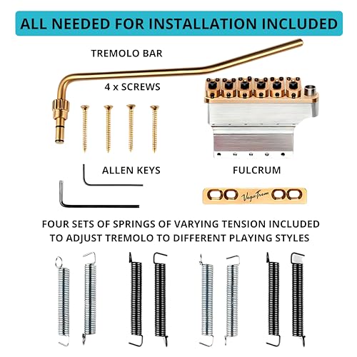 Package includes: one full tremolo bridge assembly (fulcrum, tremolo bar, screws), four sets of tremolo spring of variyng tension, allen keys