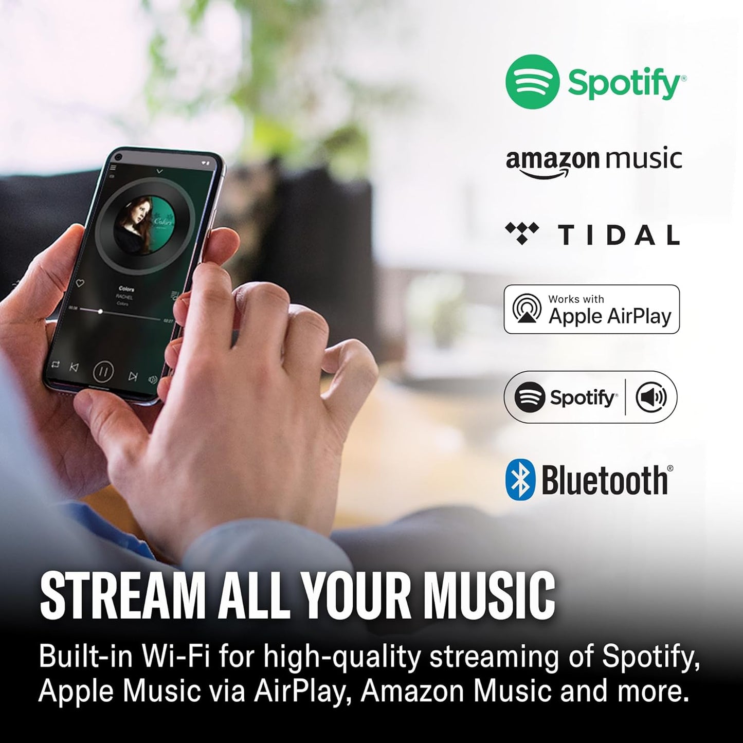 STREAM ALL YOUR MUSIC: Built-in Wi-Fi gives you stable, high-quality streaming via Spotify Connect, AirPlay 2 for Apple Music and more. Enable Alexa for streaming Amazon Music with voice control. Use Bluetooth to stream anything you want.