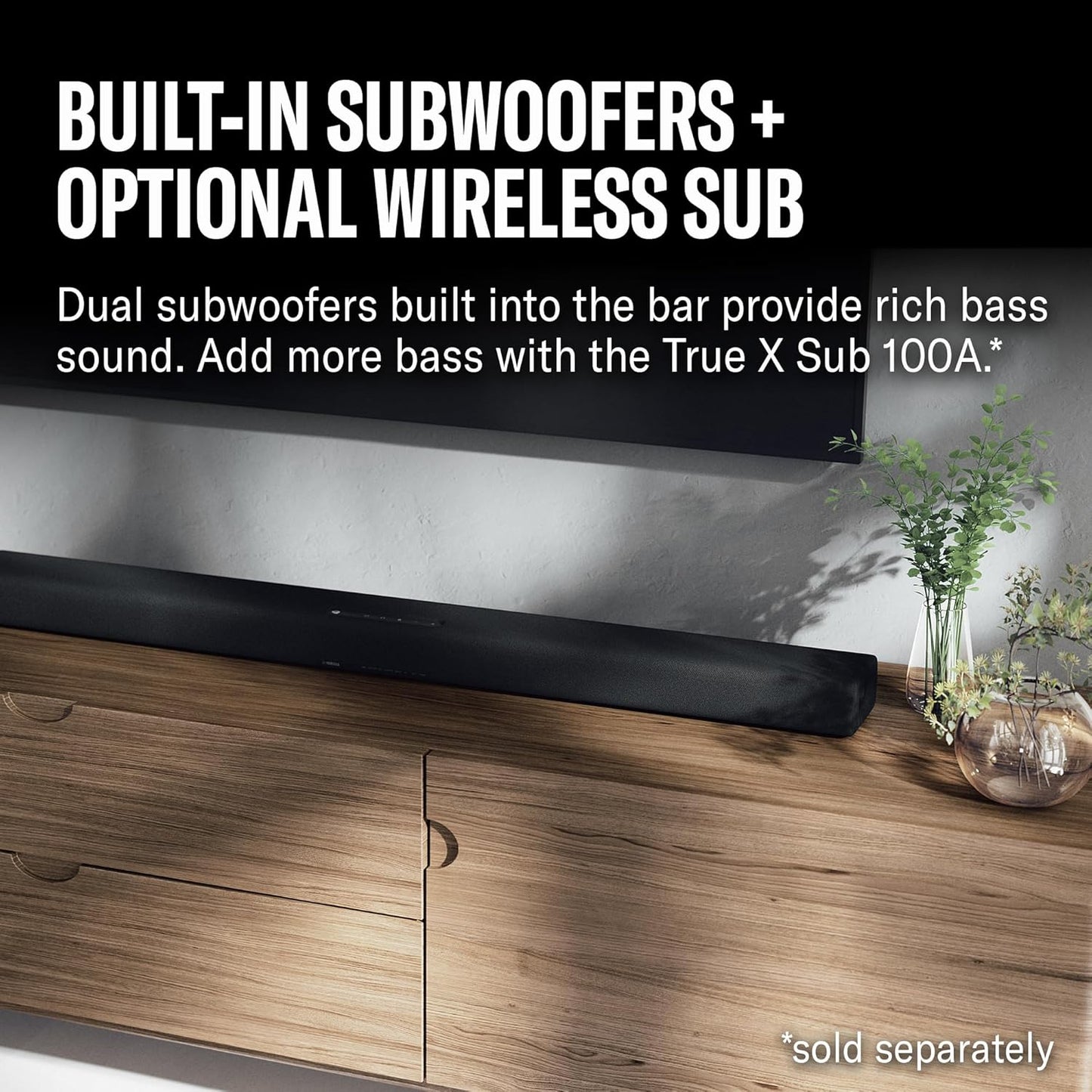 BUILT-IN SUBWOOFERS + OPTIONAL SUB: The 40A comes with two subwoofer drivers built into the bar, providing remarkable bass from a single, low-profile unit. Want more? Simply add the True X Sub 100A (sold separately), a wireless subwoofer that can be placed anywhere in your room to add even deeper, more impactful bass.